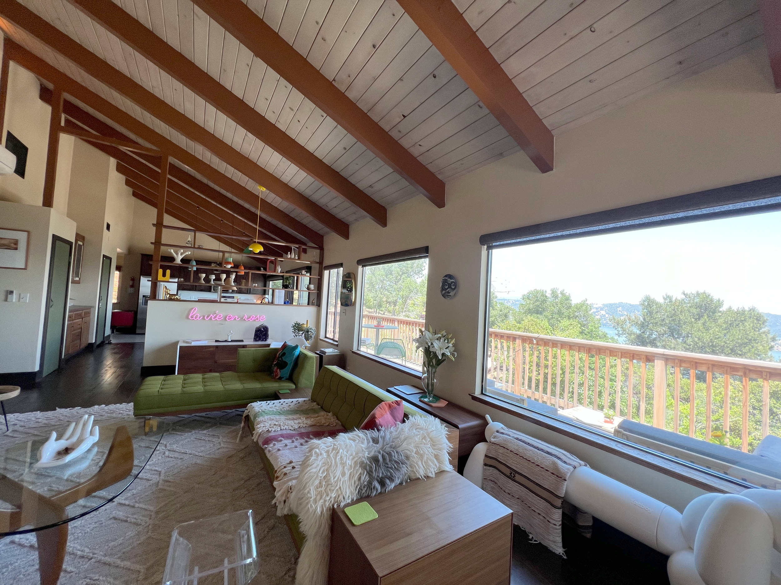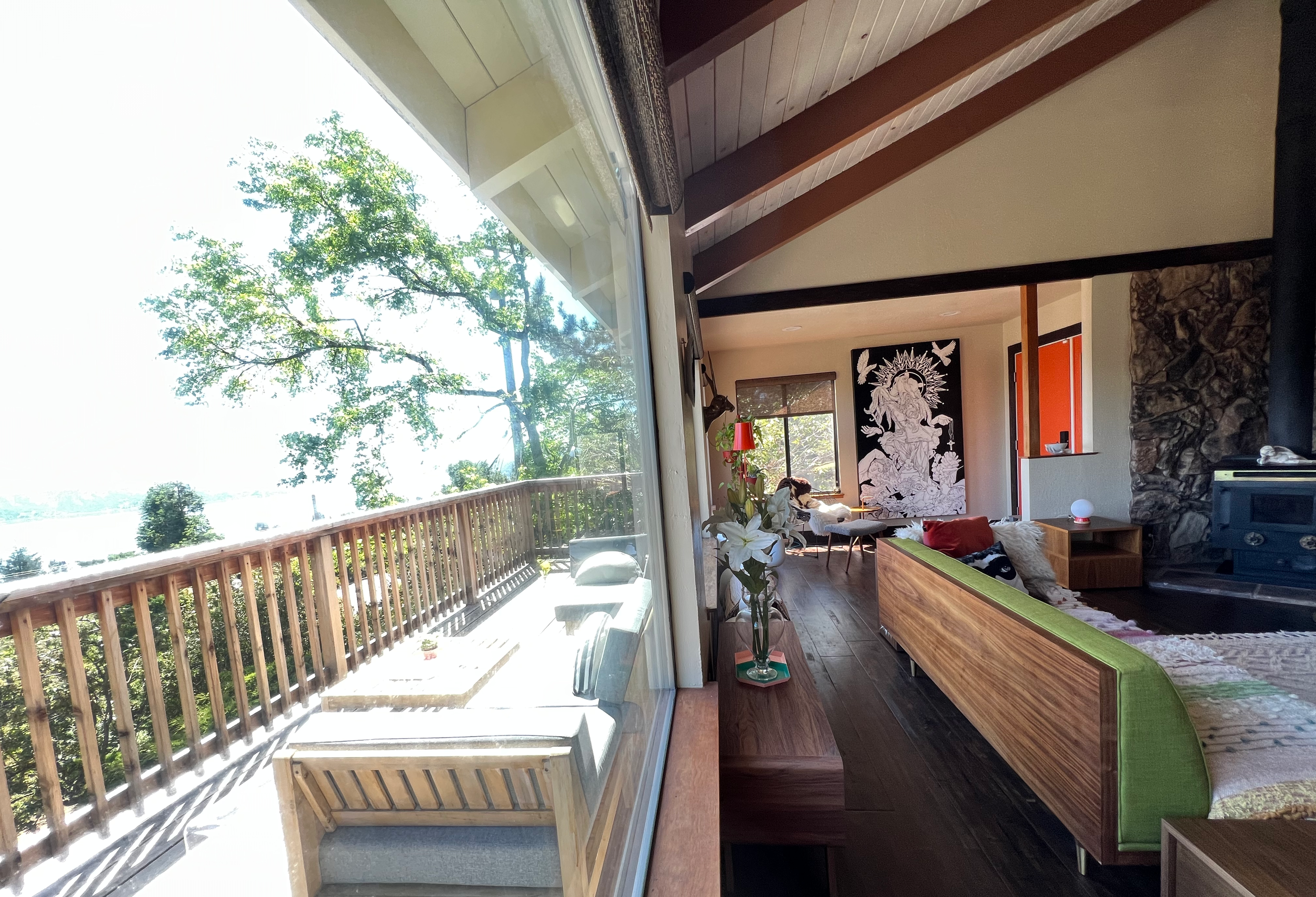 This cozy midcentury lake house offers guests a true escape from the hustle and bustle of everyday life, with a tranquil setting and great views. The outdoor patio is a great place to relax and enjoy the scenery. Other amenities include a fully equipped kitchen, bathroom, living area, air conditioning and heating.