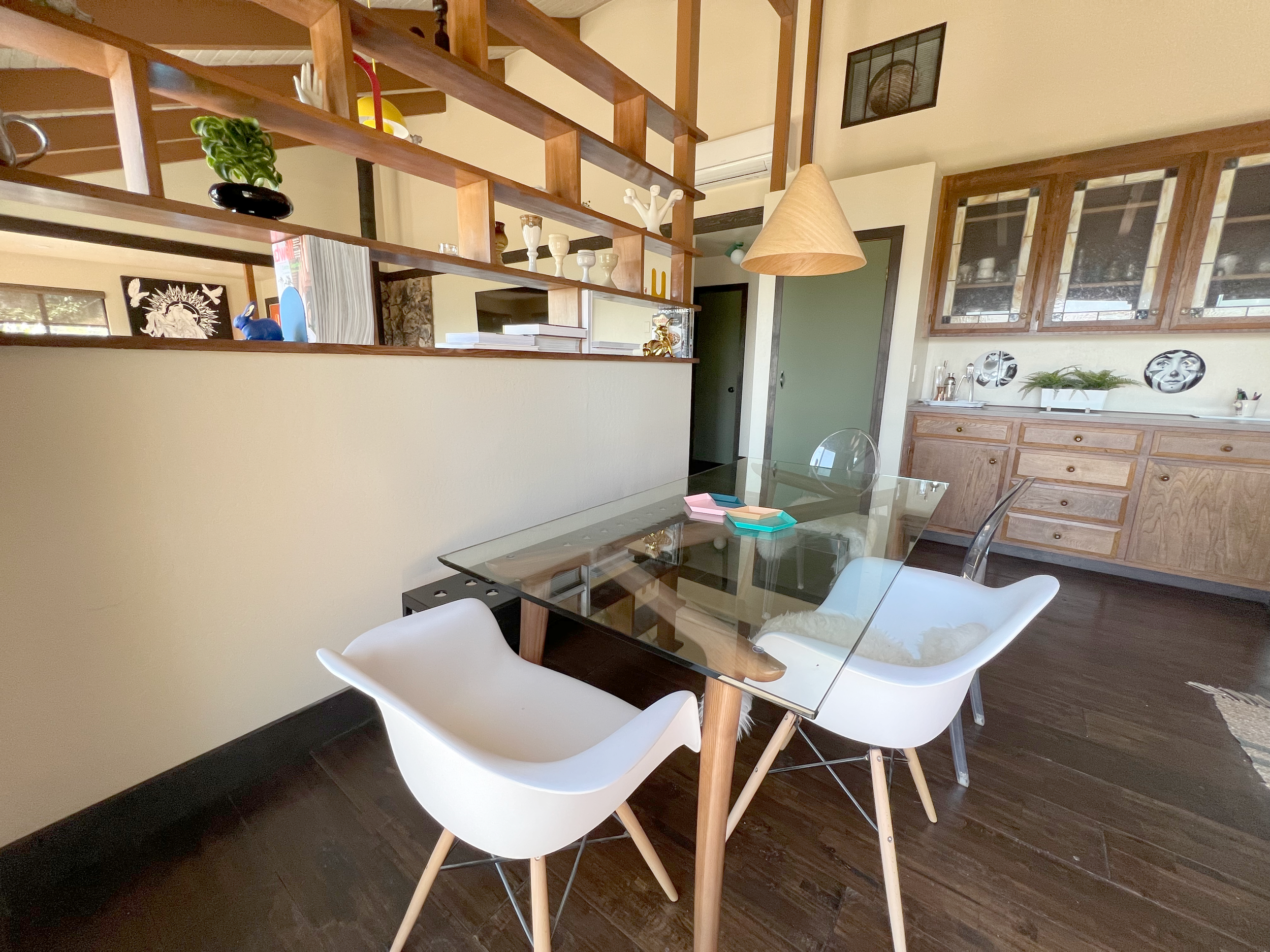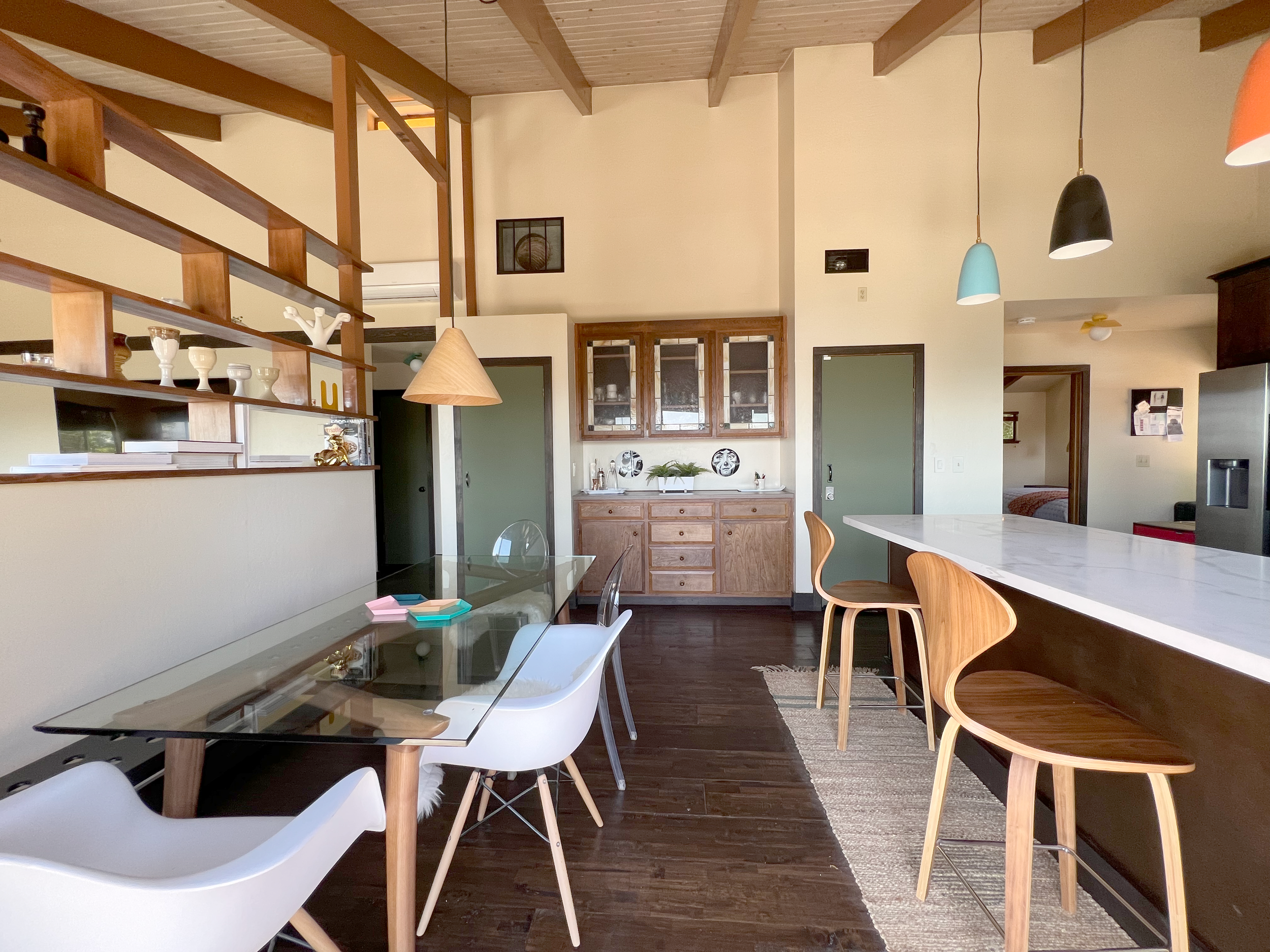 The dining room features an eclectic style with a mid-century industrial dining set as the focal point. A clear large rectangular table with a sculptural base and organically shaped legs surrounded with various styles of chairs and a long bench to create a fun dining environment.