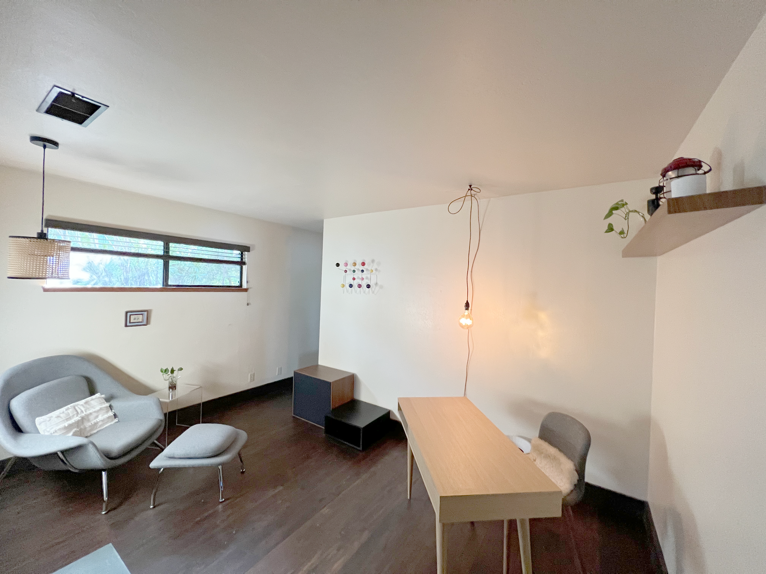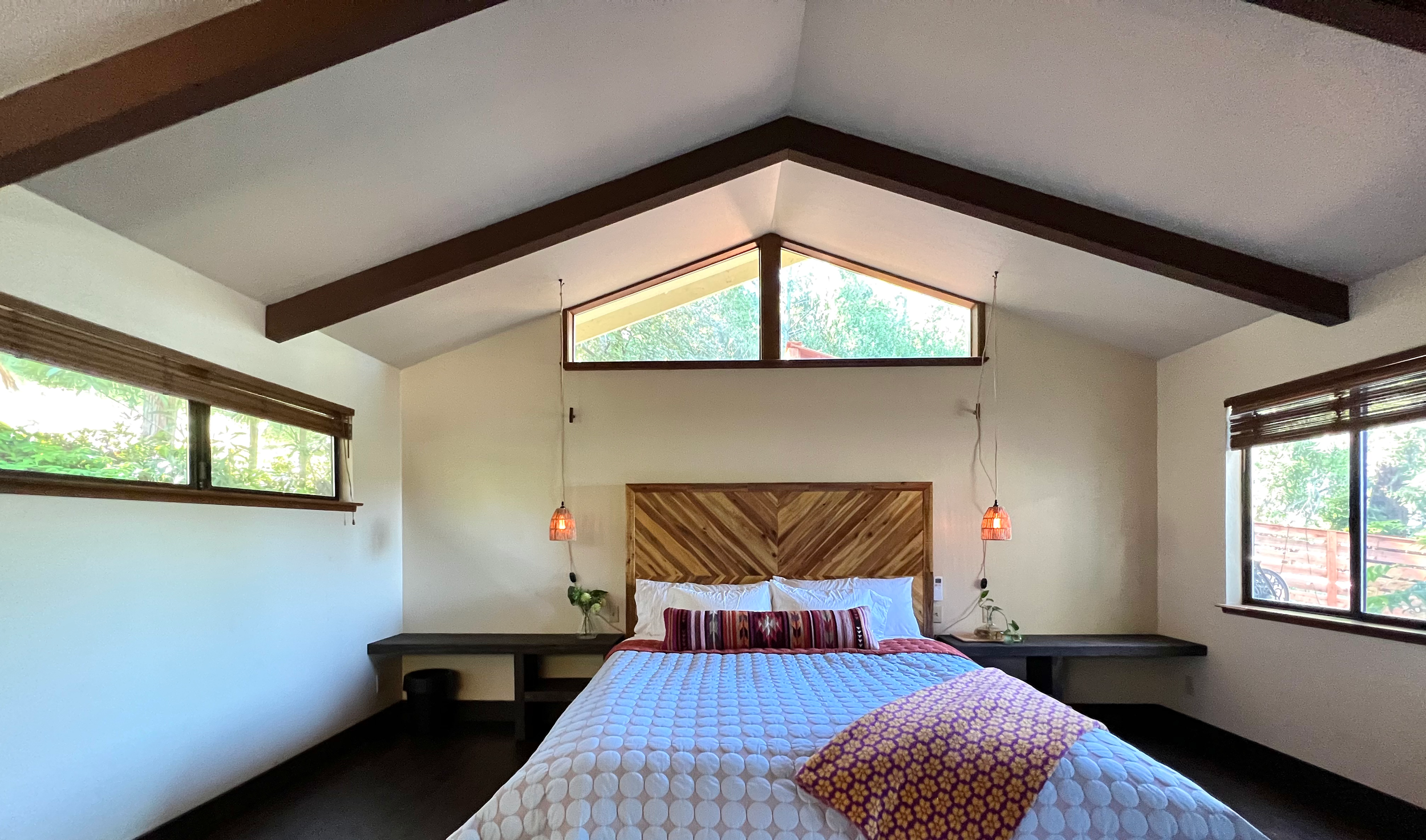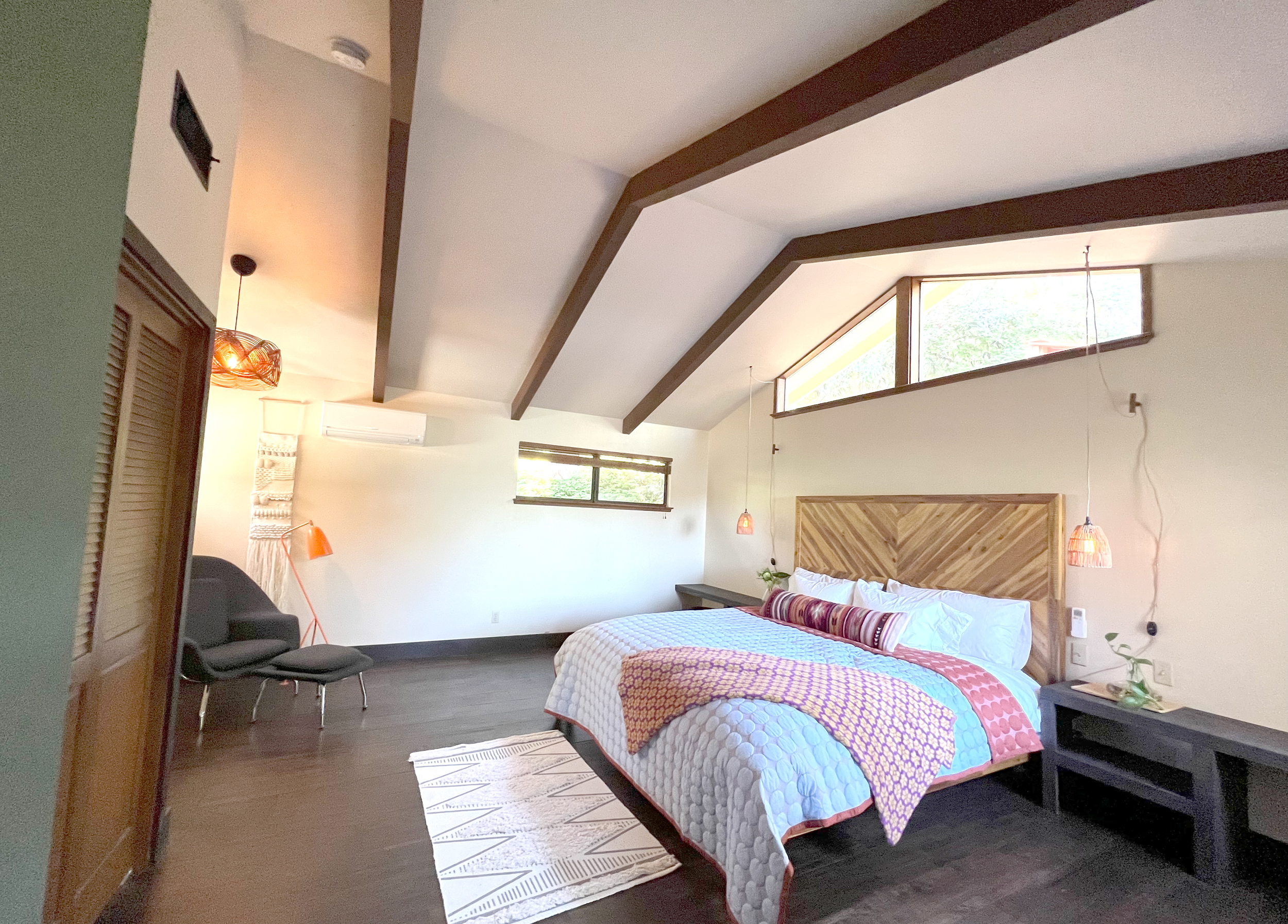 The rental is for the entire asset of the 2nd floor of the property with one outdoor patio. There is one king bed in the main bedroom, one queen bed in the guest room, two bathrooms, and an office attached to the main bedroom, making it suitable for up to four guests.