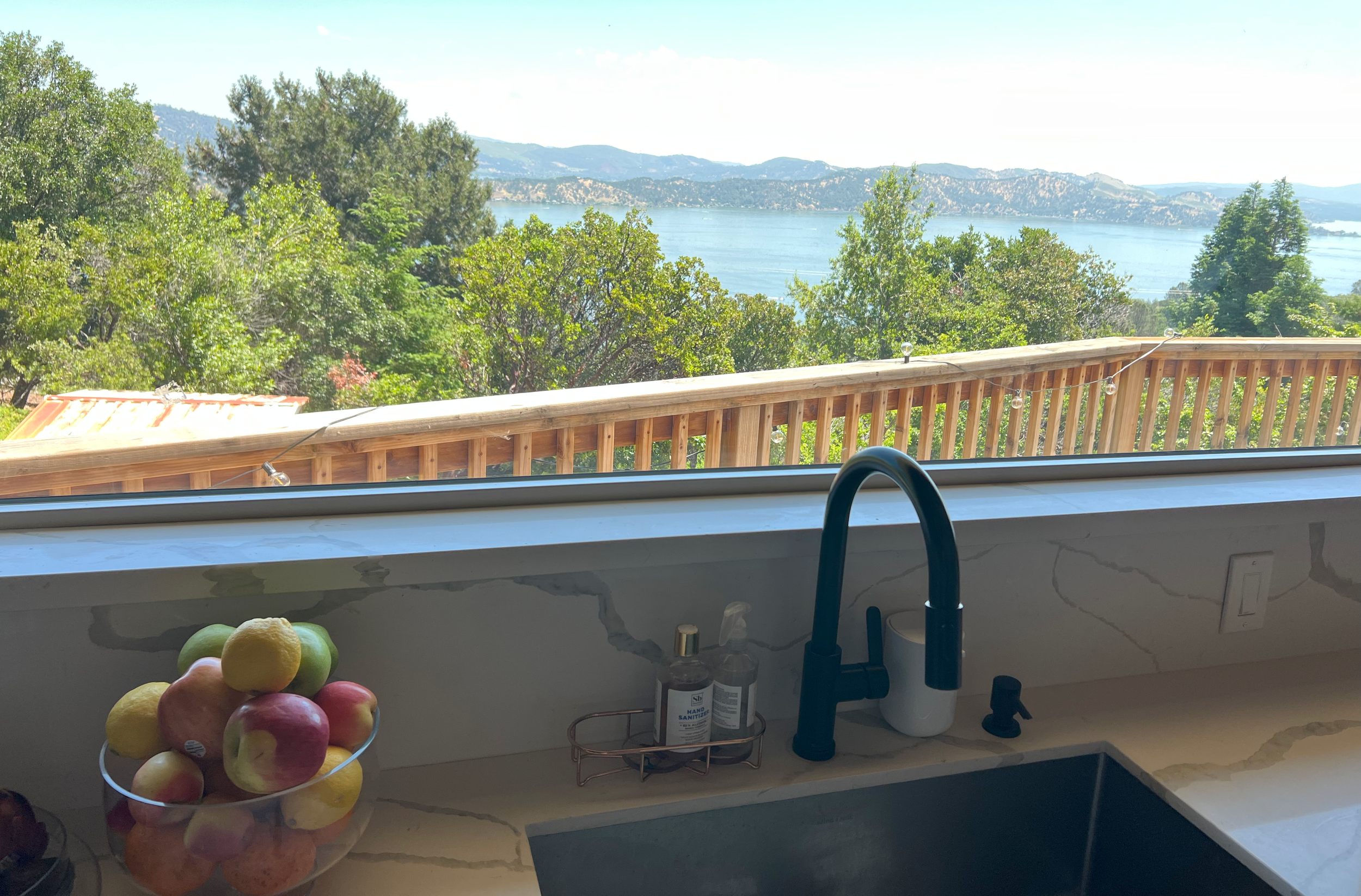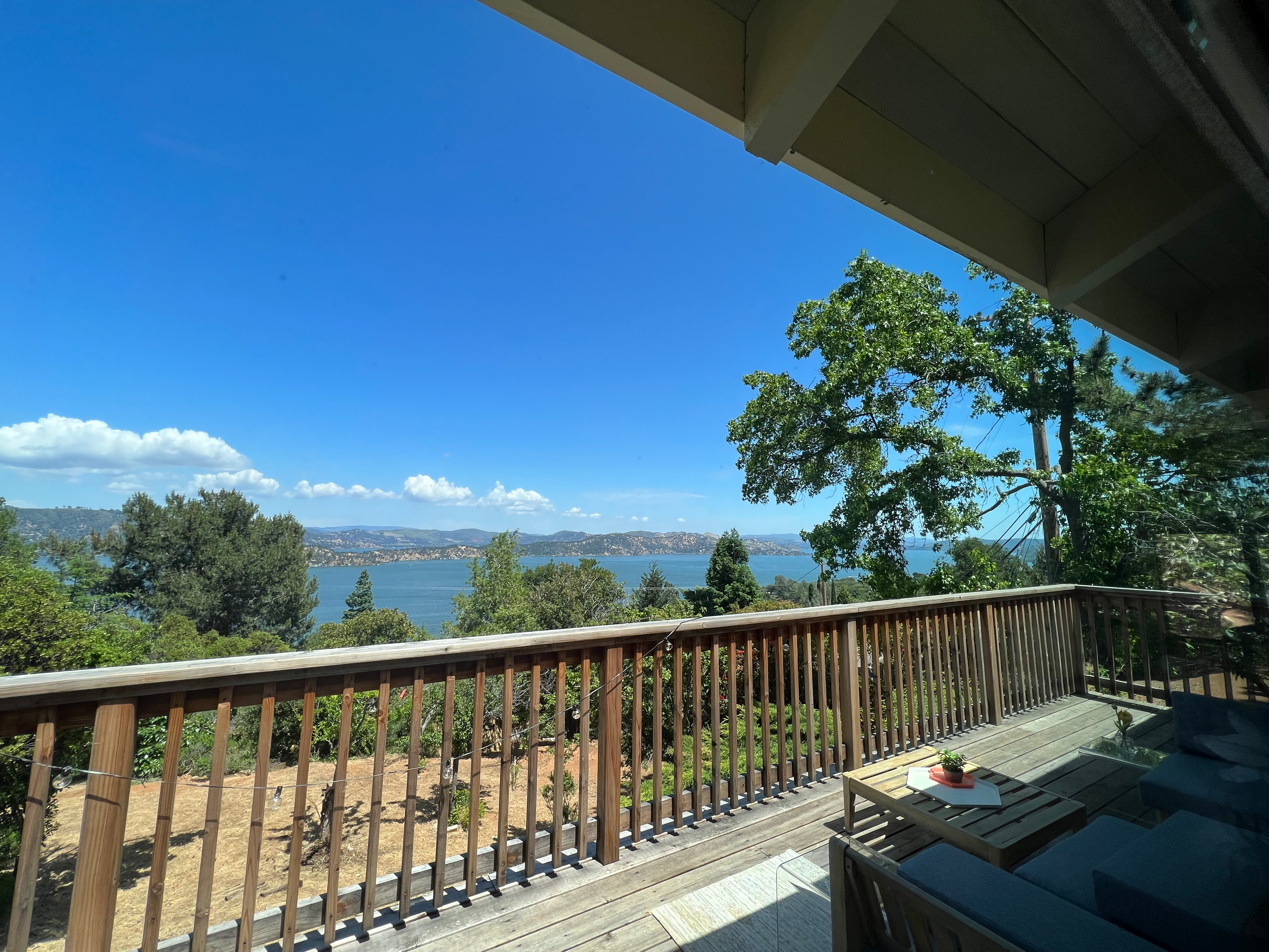 The lake house is within a 5 to 10-minute drive to the lake and offers incredible lake views from its outdoor patio.