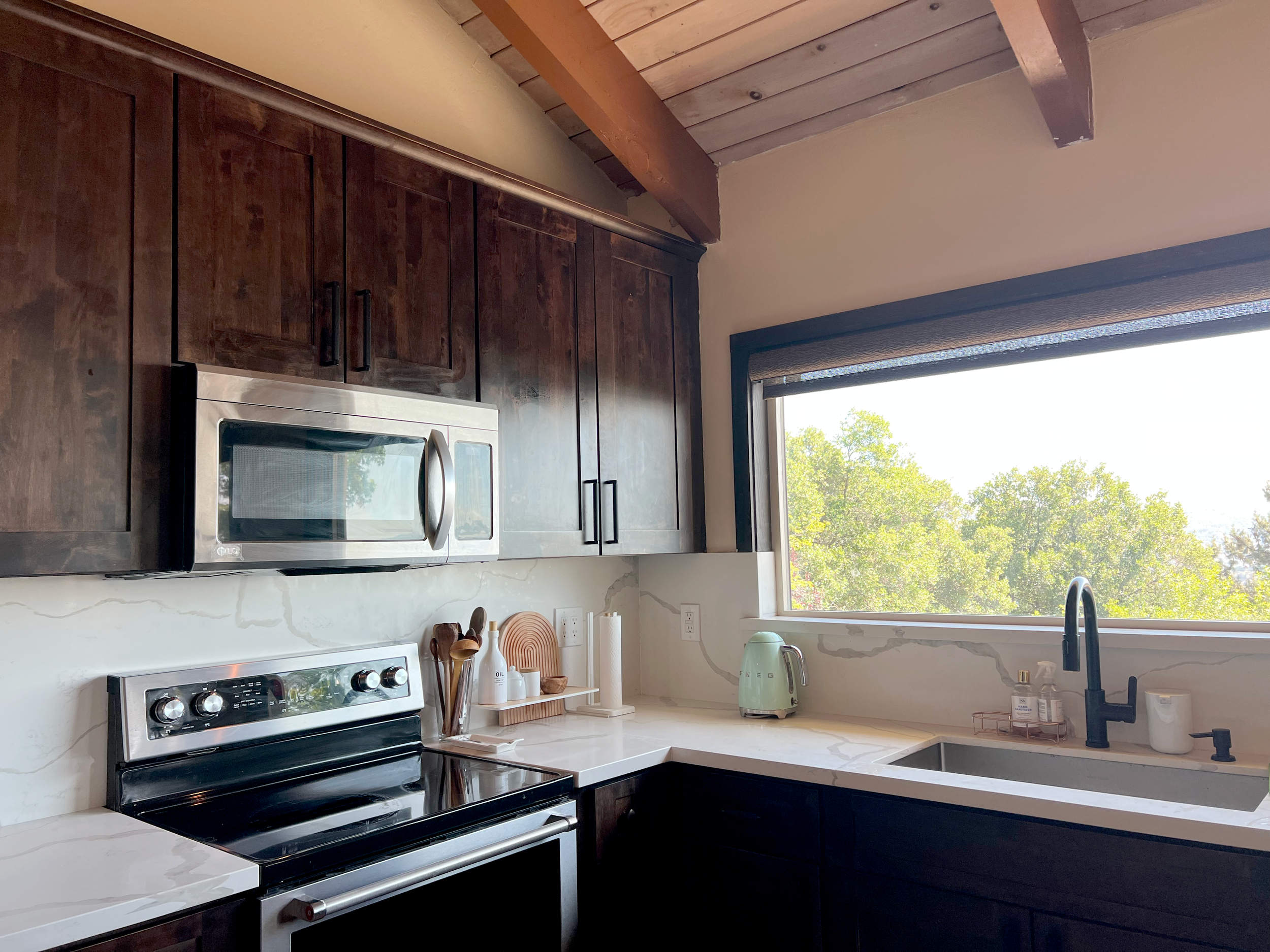 The kitchen has a functional and efficient layout with sleek cabinetry, and the countertops are made of durable quartz with patterns. Appliances are modern, featuring stainless steel. The kitchen countertops bar provides a social and interactive space where your guests can gather, chat, and enjoy drinks or appetizers while you prepare meals.